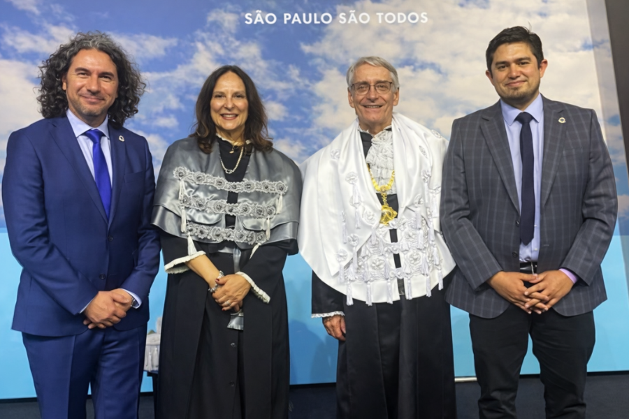 En la fotografía: Director DDE UFRO, Dr. Pablo Martínez; vice rectora USP, Liedi Légi Bariani Bernucci; rector USP, Prof. Dr. Aluísio Augusto Cotrim Segurado; y director de Internacionalización UFRO, Dr. Víctor Beltrán, en la ceremonia de inicio del nuevo rectorado de la Universidad de São Paulo, una de las instituciones de educación superior más prestigiosas y reconocidas de América Latina y del mundo. Ambas universidades han construido una relación sólida y sostenida de cooperación internacional.